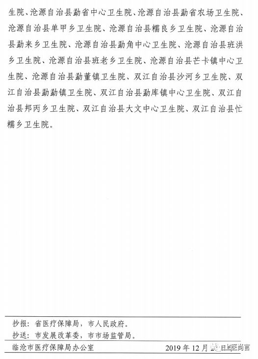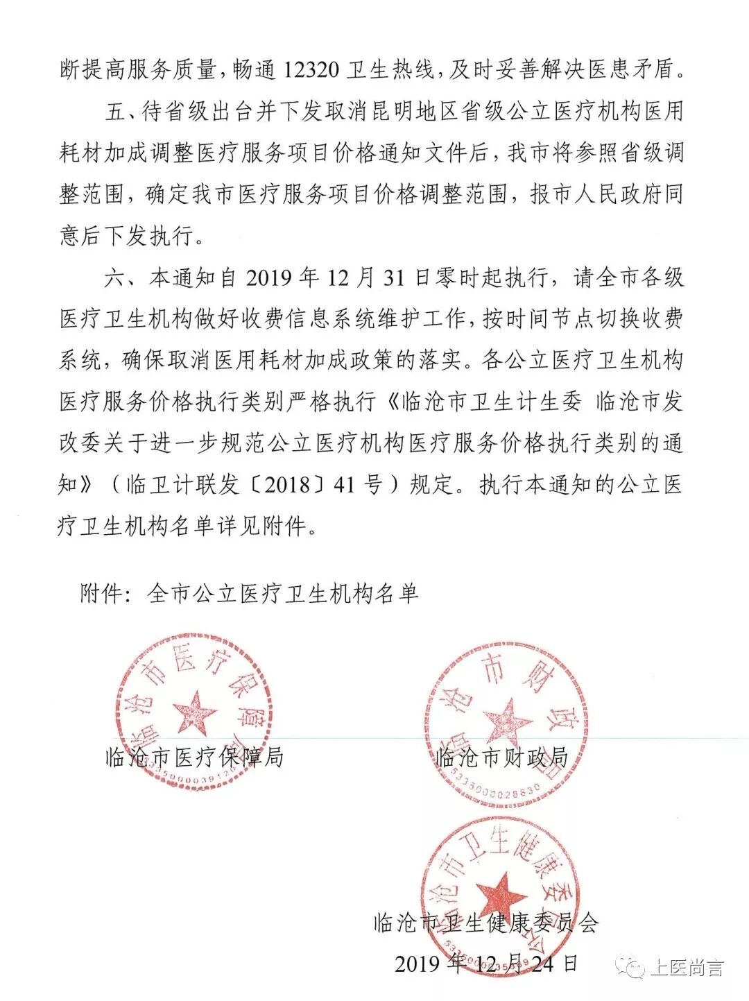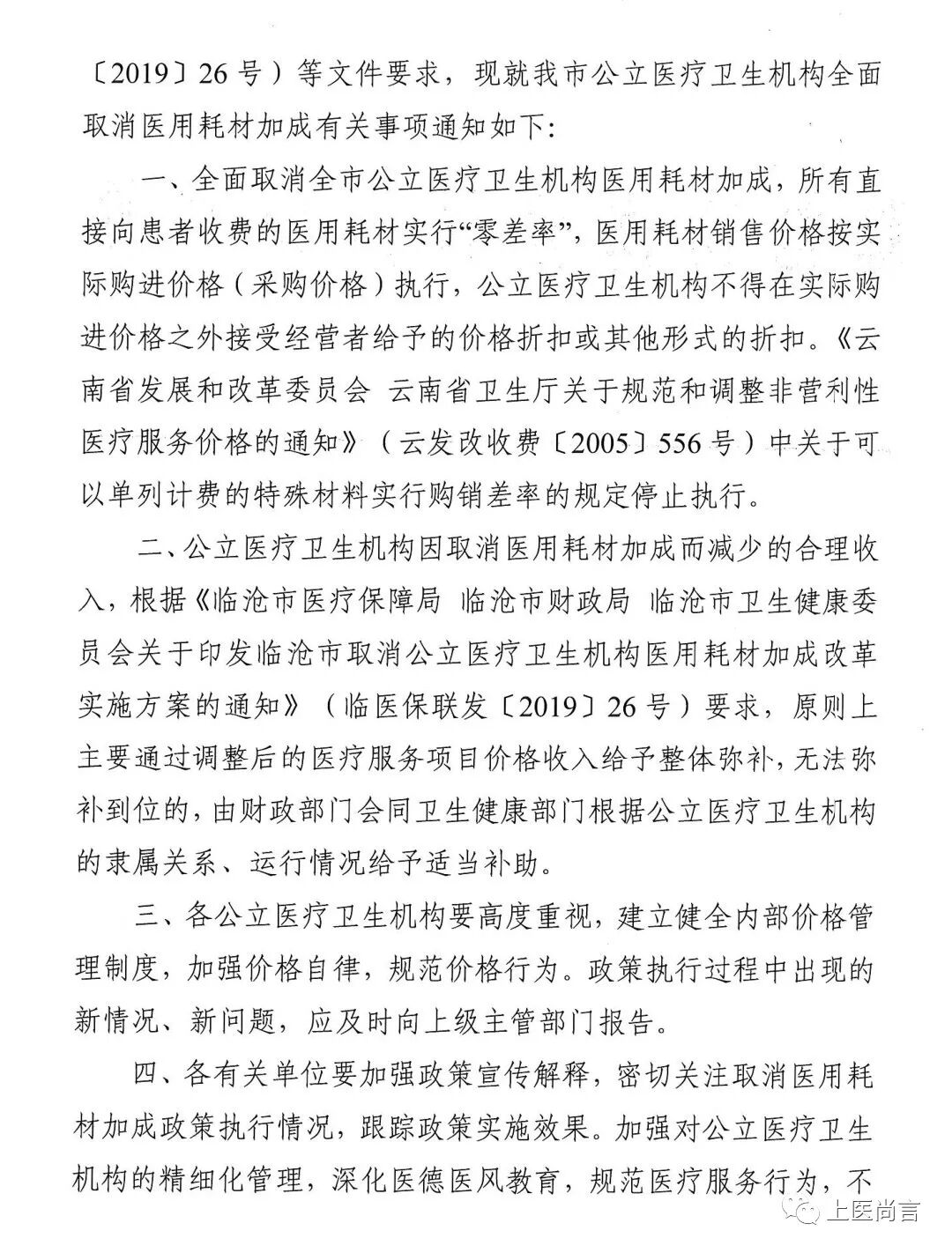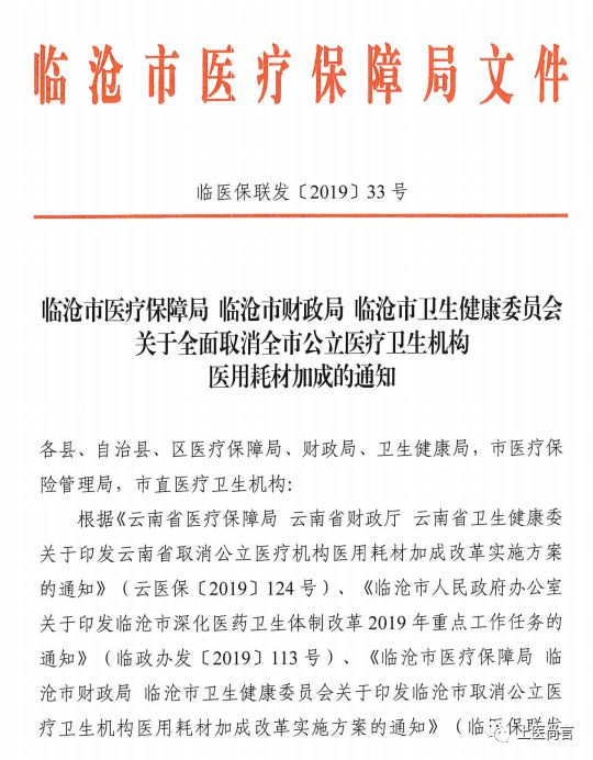 根据《临沧市医疗保障局 临沧市财政局 临沧市卫生健康委员会关于全面取消全市公立医疗卫生机构医用耗材加成的通知》(临医保联发〔2019〕33号)要求,结合云县医共体实际情况,全面取消医用耗材加成,这是继取消药品加成之后,降低群众医药费用负担的又一项重大医改惠民举措。一、取消医用耗材加成的执行时间 2019年12月31日零时。二、取消医用材料医疗机构范围云县人民医院、云县中医医院、各乡(镇)卫生院和所有村卫生室。三、取消医用材料加成的范围以上医疗机构使用的所有医耗材(含可另行收费的医用耗材和不能另行收费的医用耗材)。详情如下: