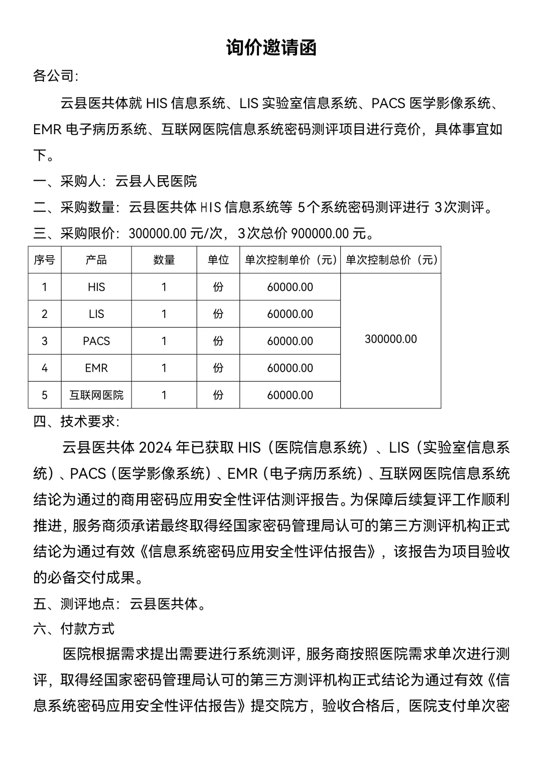 云县医共体HIS等五个系统密码测评采购询价函