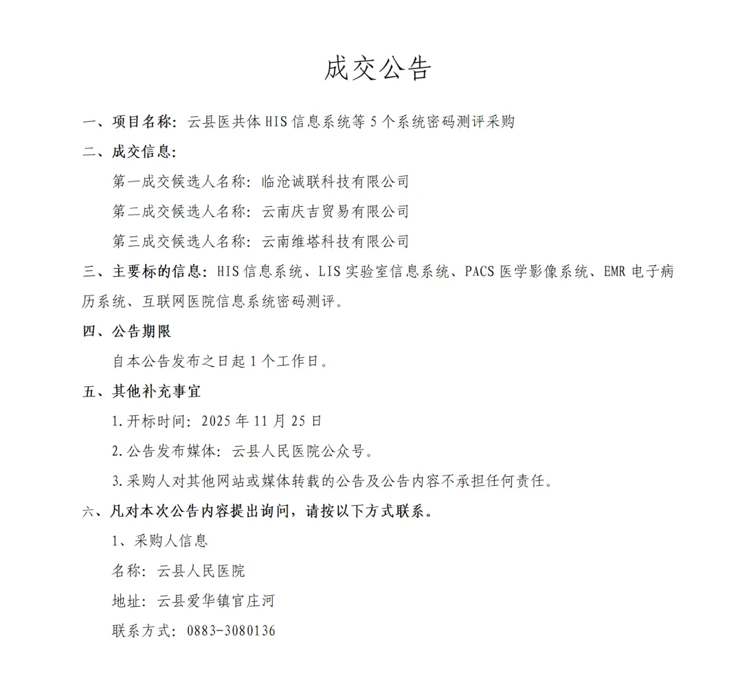 云县医共体HIS信息系统等5个系统密码评测采购成交公告